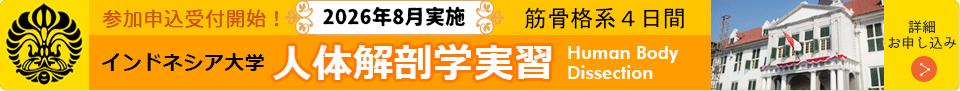 この「人体解剖実習」は、日本人のためだけのトレーニングプログラムではなく、世界中の民間療法や医療従事者たちが集まるものです。インドネシアで最も権威のある唯一の国立大学であるインドネシア大学医学部が大学の威信を掛けたトレーニングを行います。